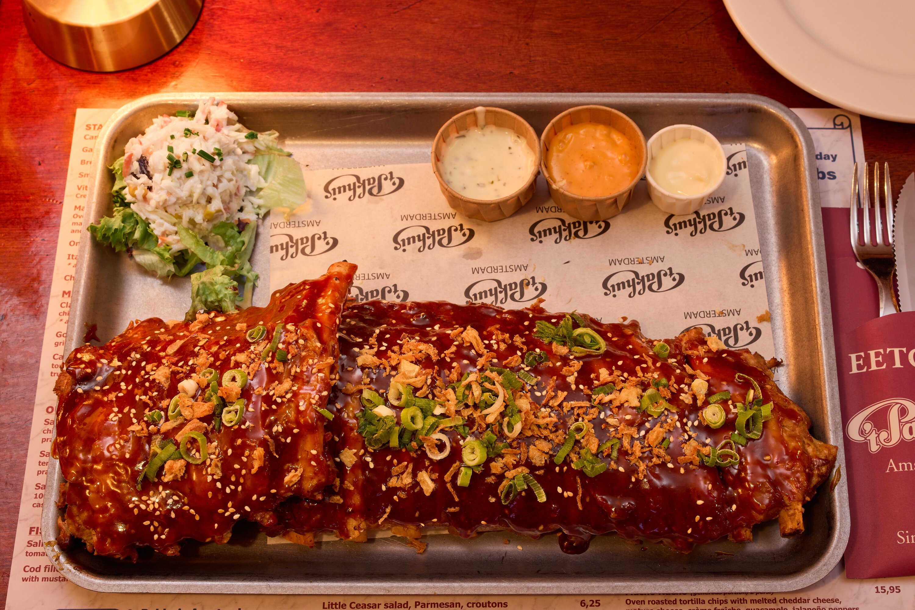 Onbeperkt spareribs eten in Amsterdam? Elke maandag, dinsdag en woensdag kun je bij 't Pakhuis dooreten tot je echt niet meer kunt. Huisgemarineerde ribs, friet, salade en sausjes — de schaal blijft komen.